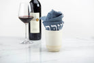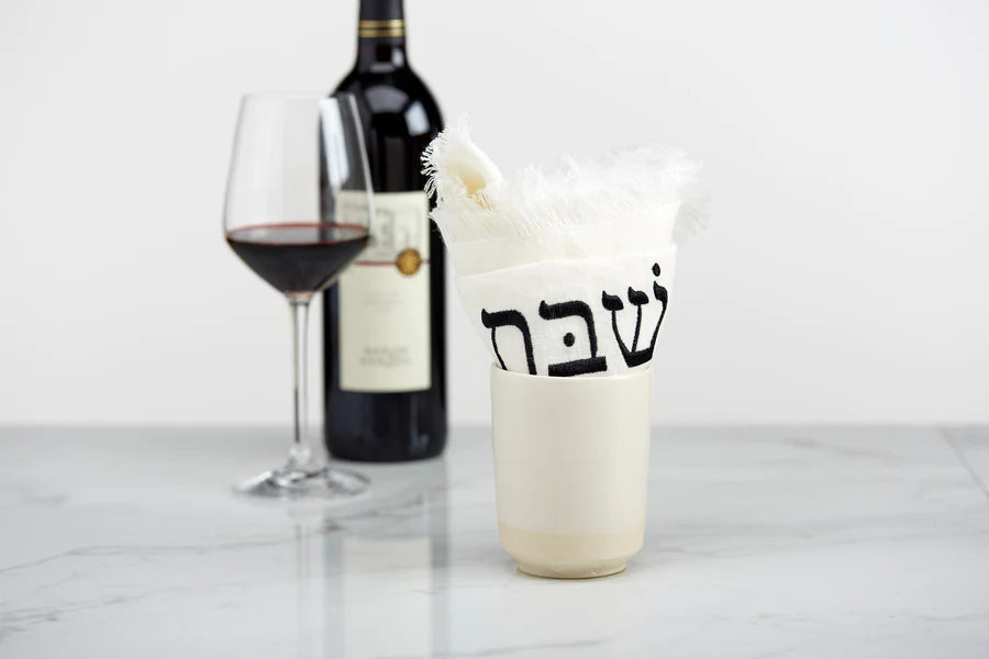 Celebrate every Shabbat moment. A ceramic kiddush cup and hand-embroidered linen challah cover come together to bring beauty and joy to your table