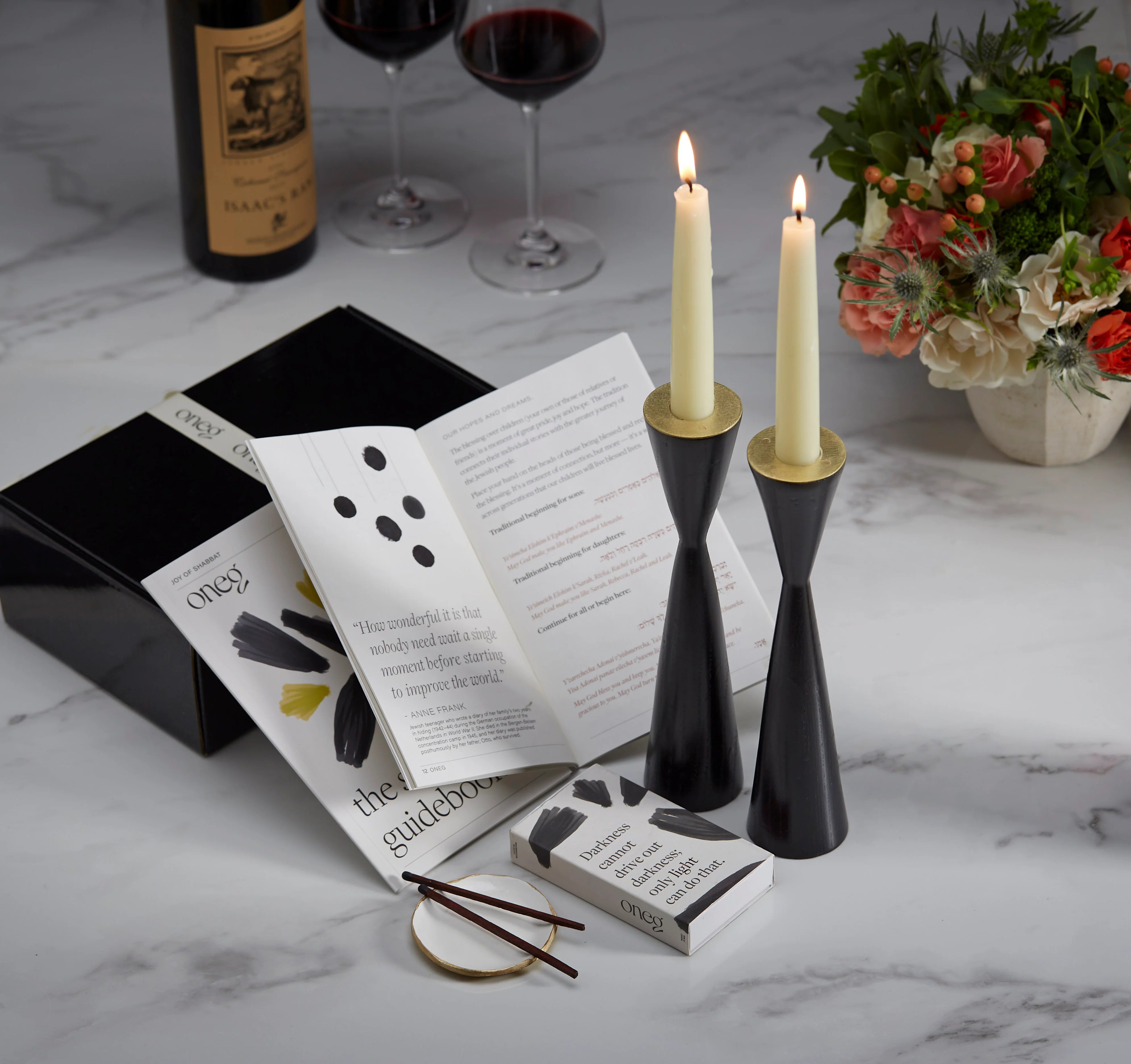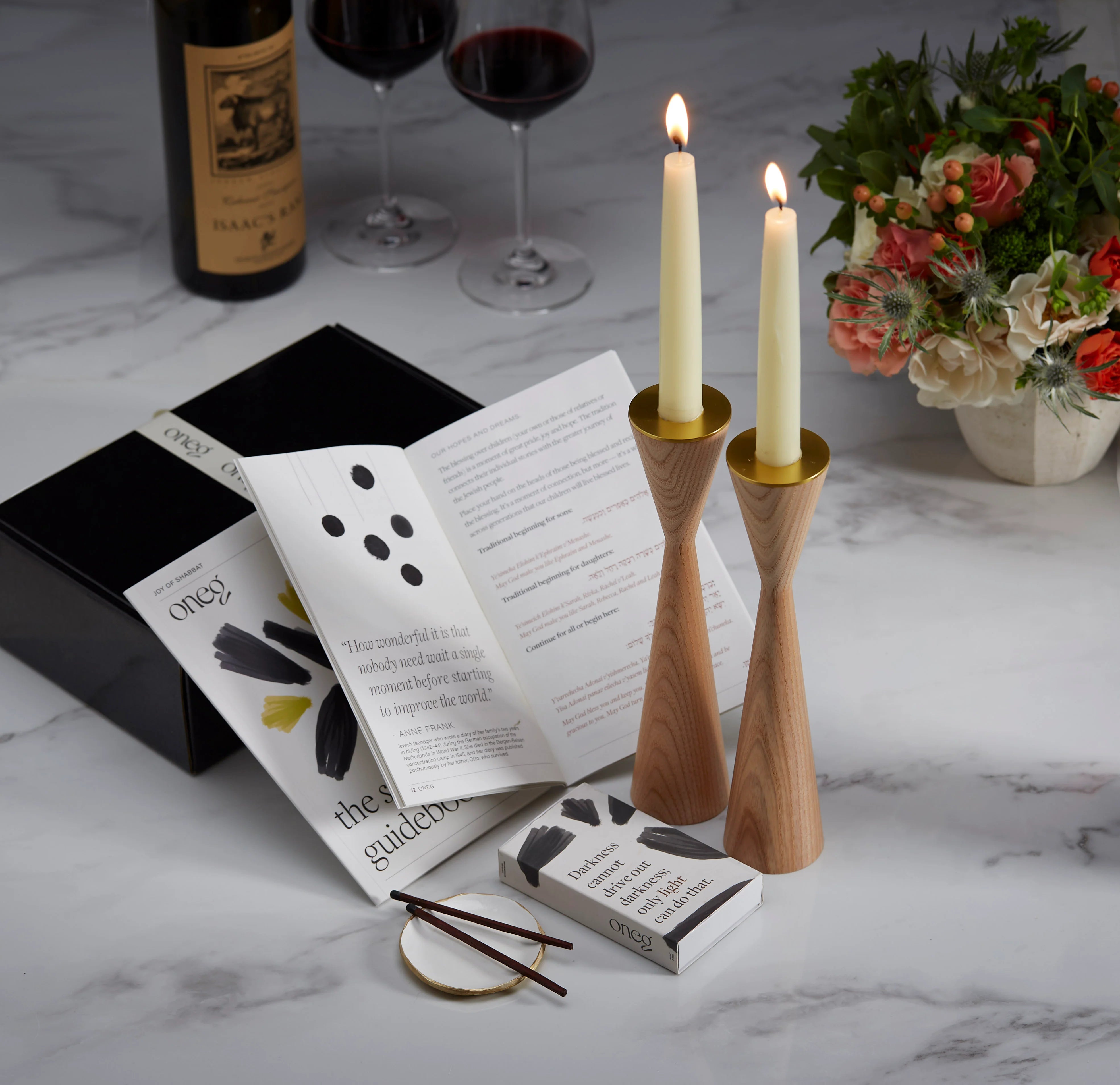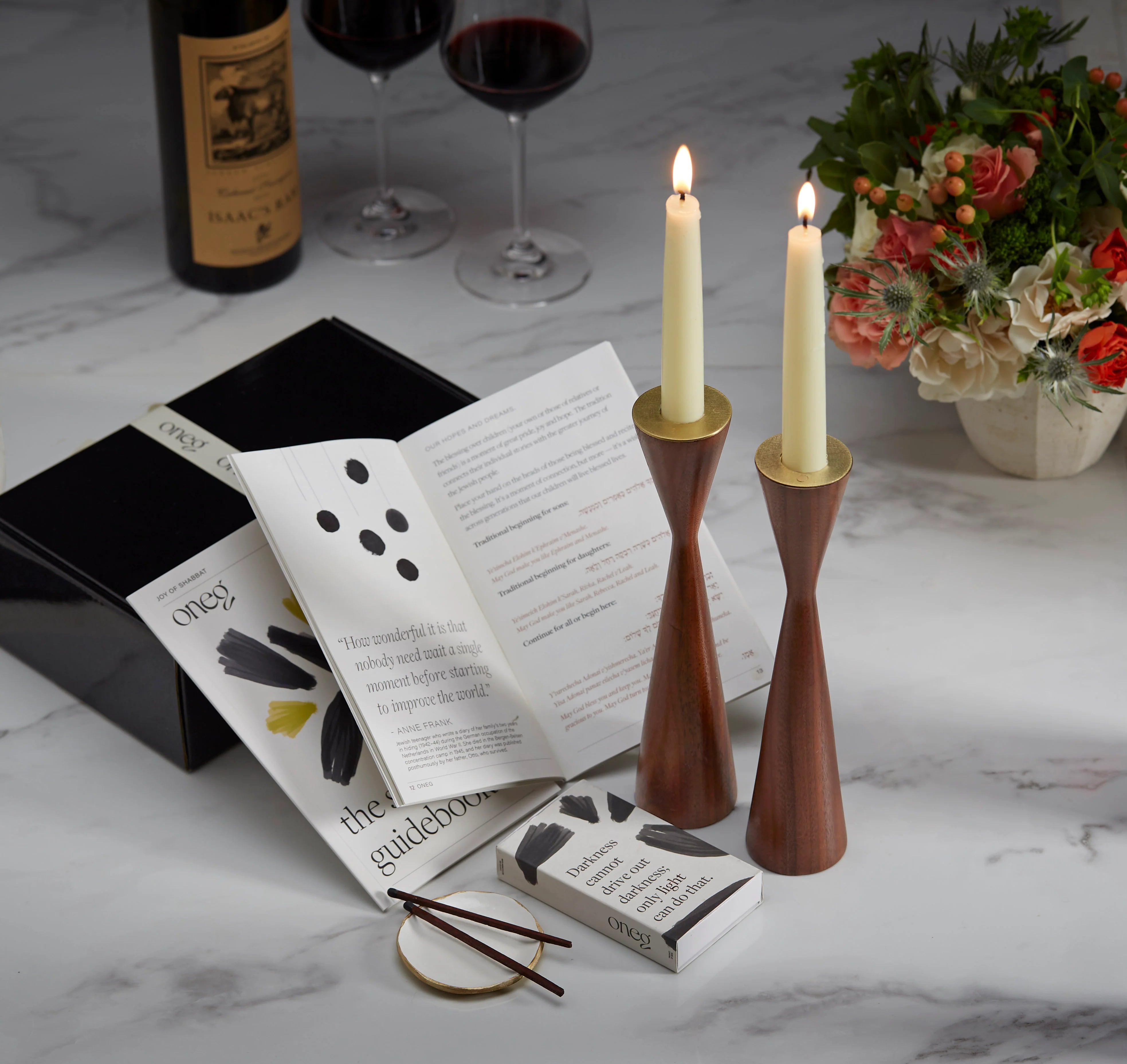 Date night, elevated. Thoughtful conversation guided by our Oneg guidebooks, a beautifully set table with candlelight, and all the details to create a warm, intimate Shabbat evening- perfect for connection, reflection, and a little romance.